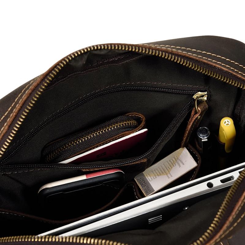 • Apart from the front pockets, the bag has a zipper pocket in the front accompanied by a leather puller.