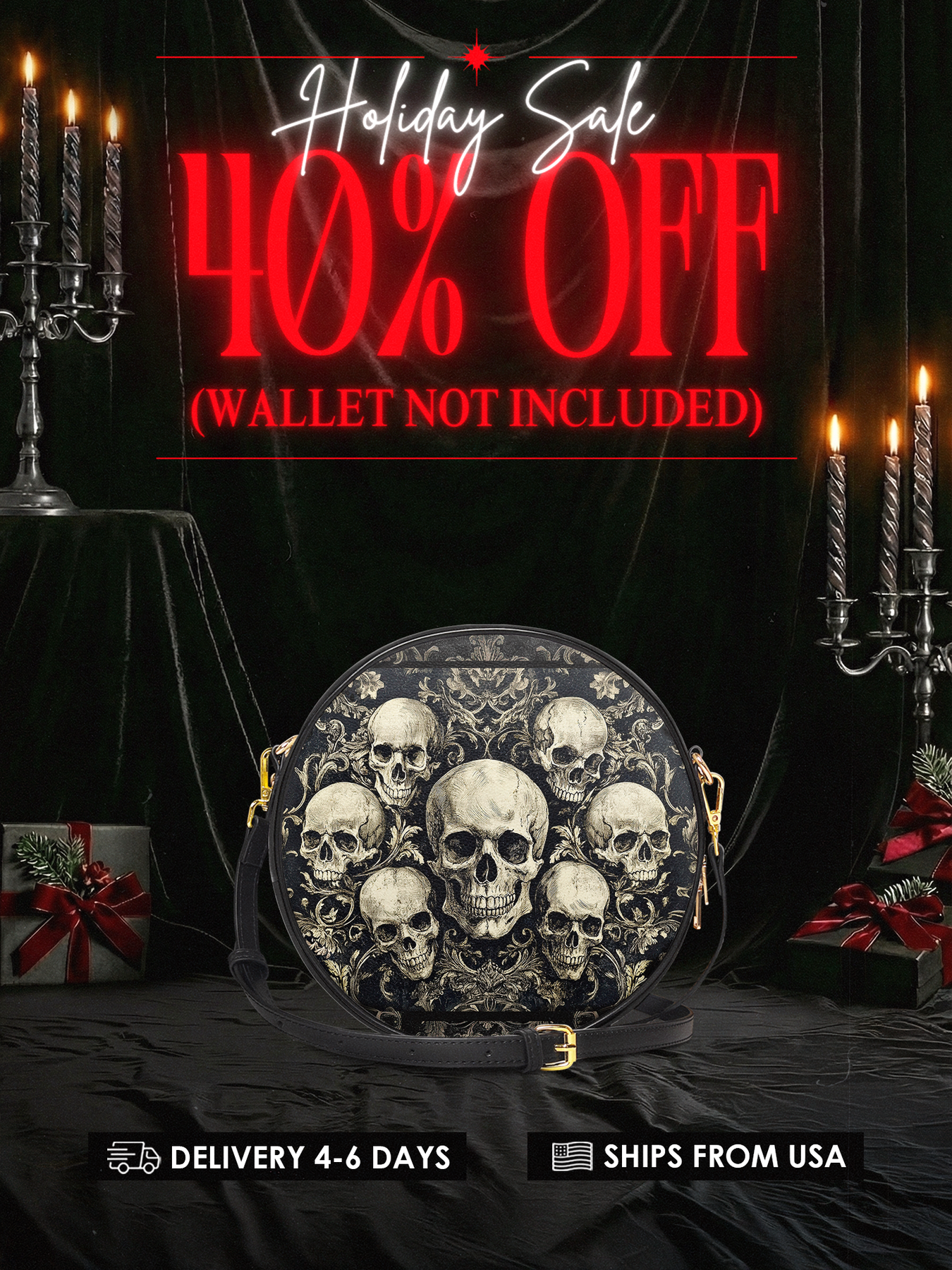 The Deathmark circle crossbody is a striking emblem of power, defiance, and dark beauty. A bold arrangement of aged skulls rests atop intricate baroque scrollwork, creating a design that feels both ancient and rebellious. With its rich contrast and commanding presence, this bag doesn’t whisper—it declares. Made for those who walk the world with quiet intensity and unapologetic edge.